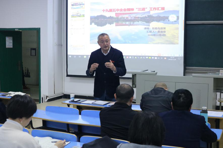 2020年12月8日下午,马克思主义学院举办“党的十九届五中全会精神进课堂”集体备课会。校党委书记夏良玉出席并讲话,马克思主义学院全体思政课教师参加了备课会。
